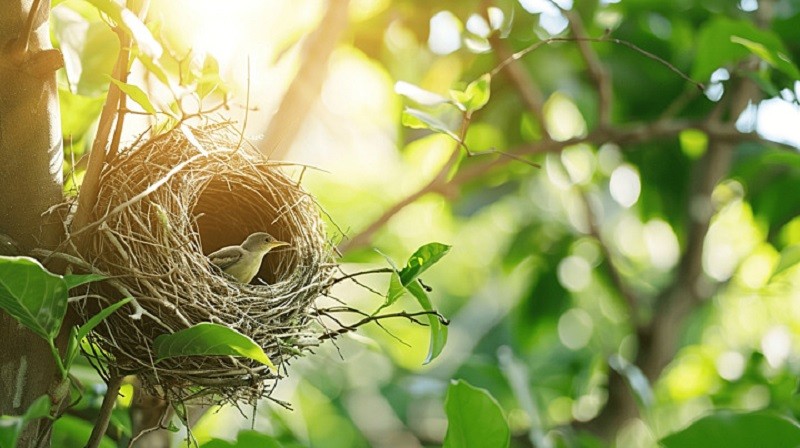 Chim làm tổ trên cây: Chim thường chọn những cành cây cao để làm tổ, giúp chúng tránh được sự tấn công của kẻ săn mồi. Cây không bị ảnh hưởng tiêu cực vì tổ chim không gây hại cho sự phát triển của cây.