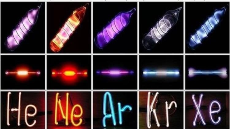 • Neon (Ne): Chiếm khoảng 18 ppm trong khí quyển, neon nổi tiếng với khả năng phát ra ánh sáng màu đỏ cam đặc trưng khi có dòng điện chạy qua nó. Vì vậy, đèn neon được sử dụng rộng rãi trong sản xuất đèn quảng cáo.