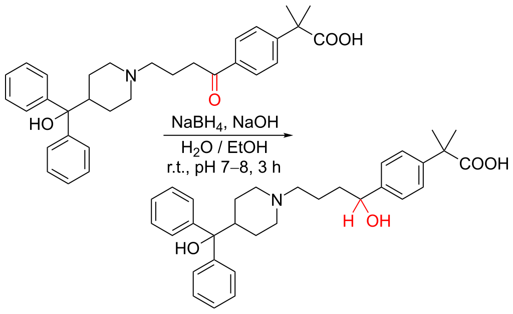 – Tham gia khử aldehyt và xeton thành rượu. Đồng thời, nó cũng là chất khử đối với các dẫn xuất của axit cacboxylic phản ứng mạnh hơn, chẳng hạn như acyl clorua và este thiol. Nhưng không giống như các chất khử mạnh Tuy nhiên, không giống như chất khử mạnh lithium nhôm hydrua, chỉ sử dụng NaBH4 trong điều kiện phản ứng hợp lý sẽ không làm giảm este, amit hoặc axit cacboxylic. Natri borohydrua được sử dụng trong sản xuất công nghiệp fexofenadine. Trong đó, nó tham gia vào giai đoạn giảm.