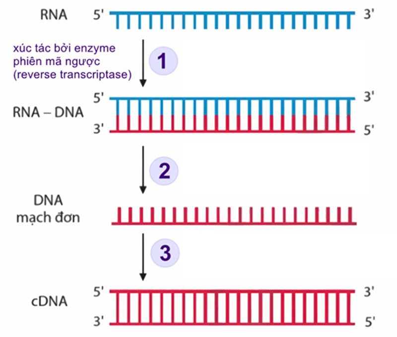 - Bước 1: Tạo DNA bổ sung (cDNA) Enzyme phiên mã ngược đọc RNA của virus và bắt đầu tổng hợp chuỗi DNA bổ sung. Chuỗi DNA này được gọi là DNA bổ sung (cDNA).