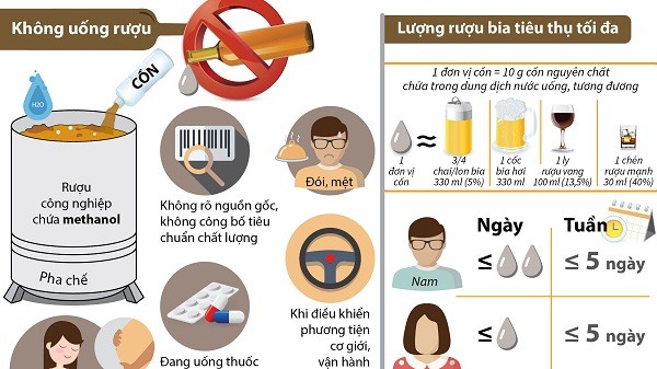 – Xem rõ thành phần của rượu, tuyệt đối không uống rượu có hàm lượng Metanol > 0,1%.